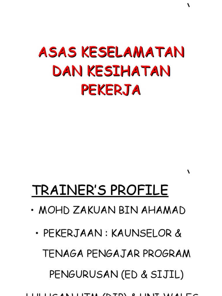 Kursus Asas Keselamatan Di Tempat Kerja by zulkurnain shuib. Baca versi flipbook dari Asas Keselamatan dan Kesihatan Pekerjaan.